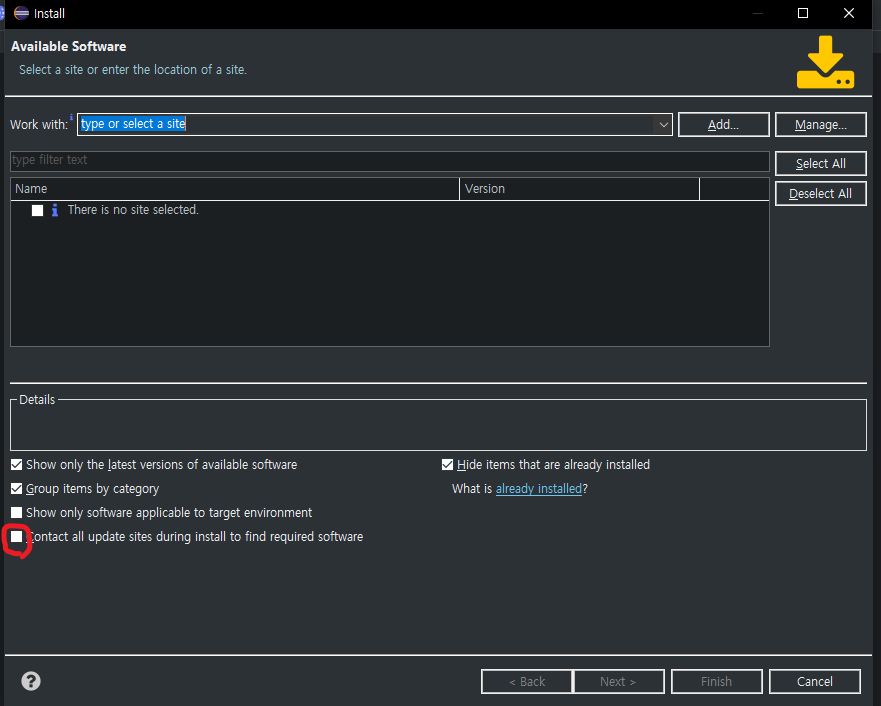 Contact all update sites during install to find required software를 체크해제 한뒤에 Cancel을 눌러줍니다.
