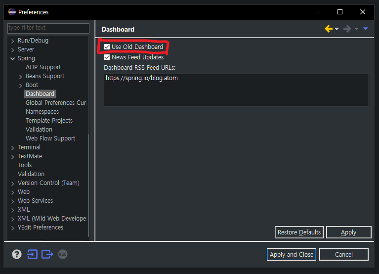 Preferences -> Spring -> Dashboard 에 들어온다음 Use Old Dashboard를 클릭하면 나온다고하여 확인해봤지만